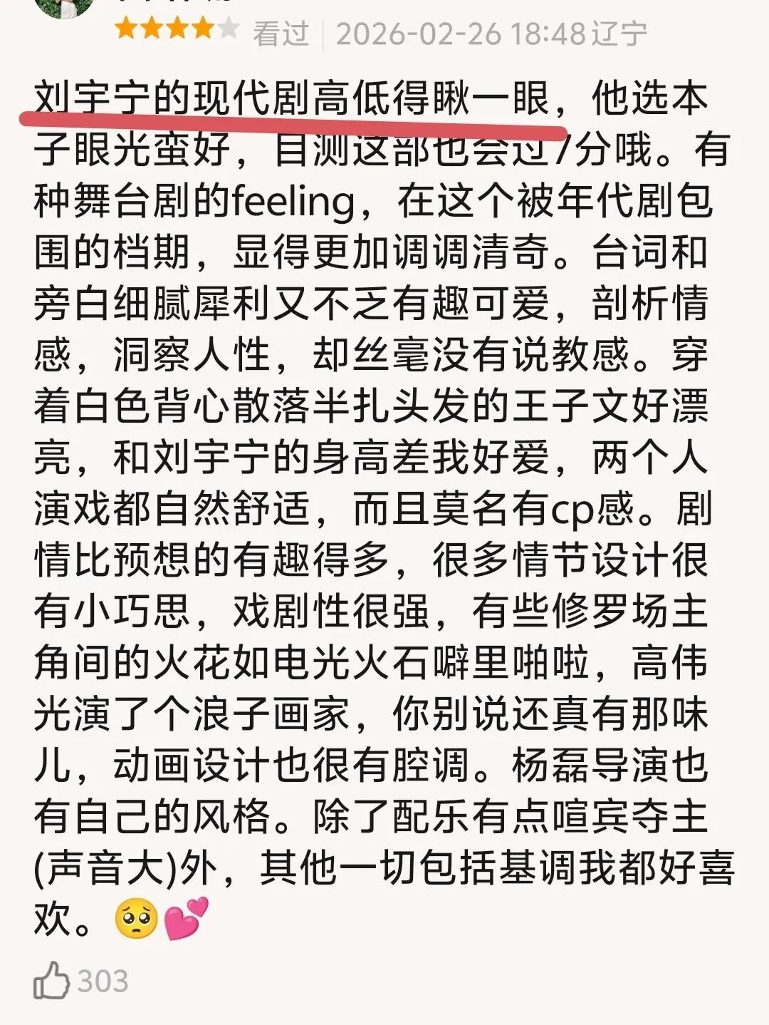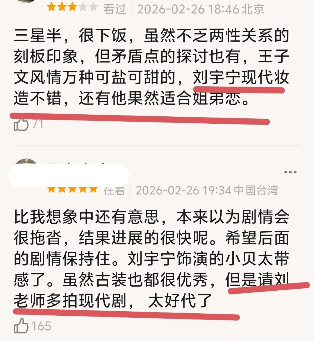 网友的首播评价也是一针见血:古装丑男大翻身,刘宇宁现代妆造不错,请多拍现代剧!