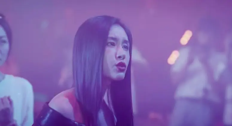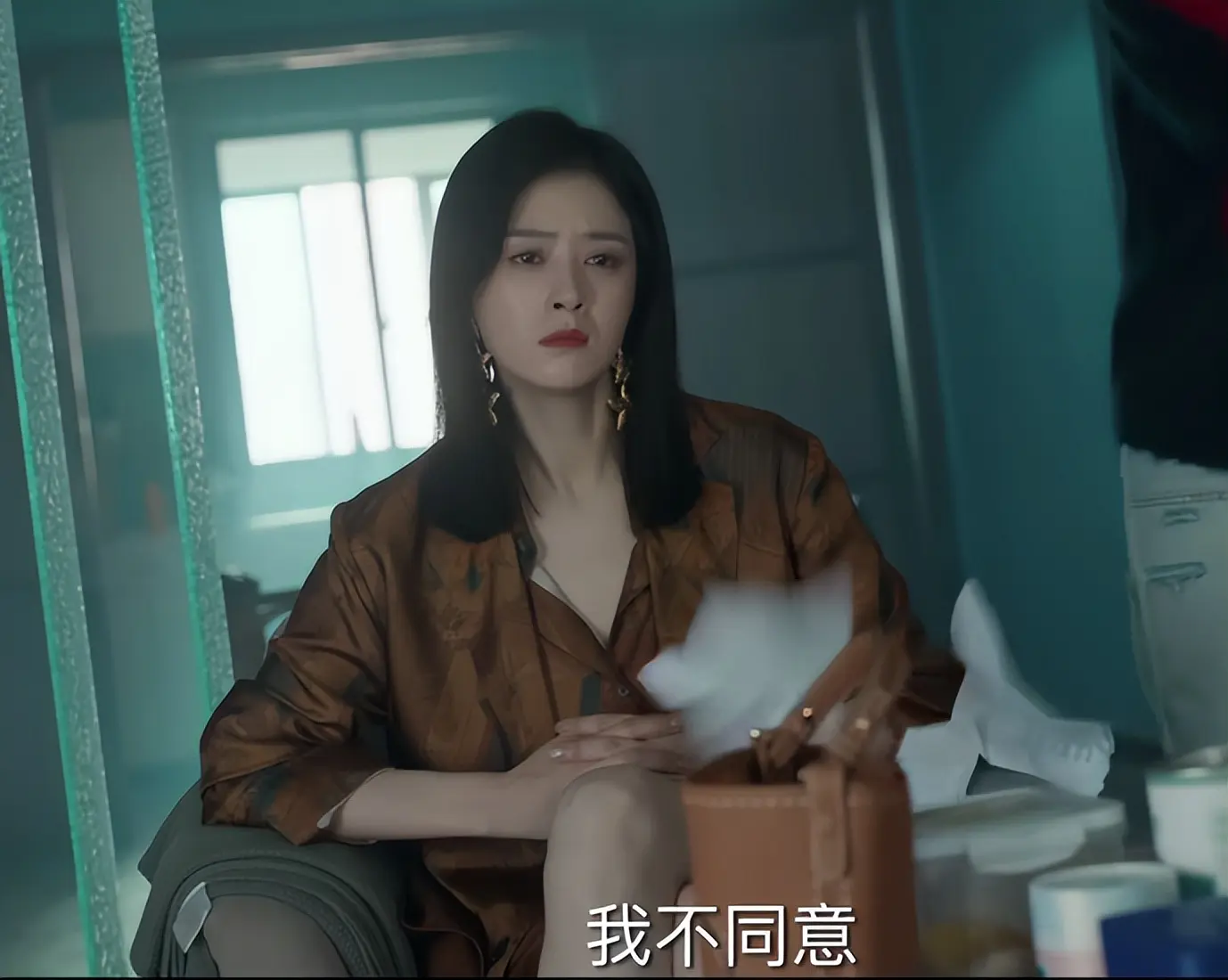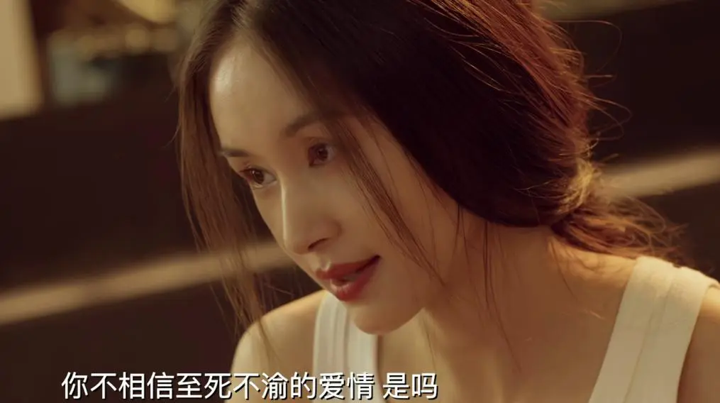 肢体语言透着疏离与防备,这是她常年伪装成不同完美情人练就的防御姿态,也是她不相信爱情的外在表现。